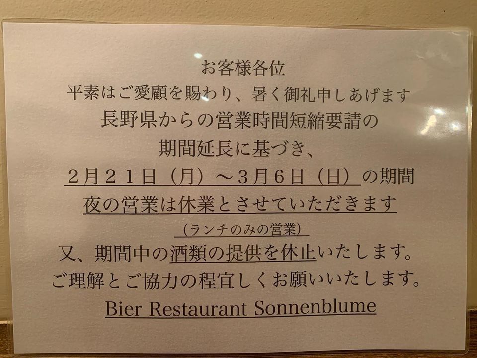 営業時間短縮要請の延長に伴い2月21〜3月6日迄の期間ディナーの営業を休業させていただきます。